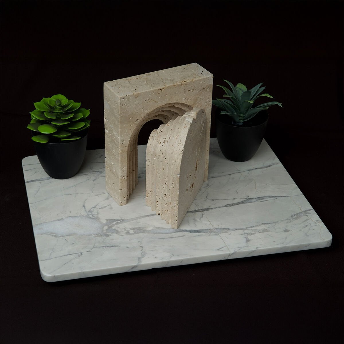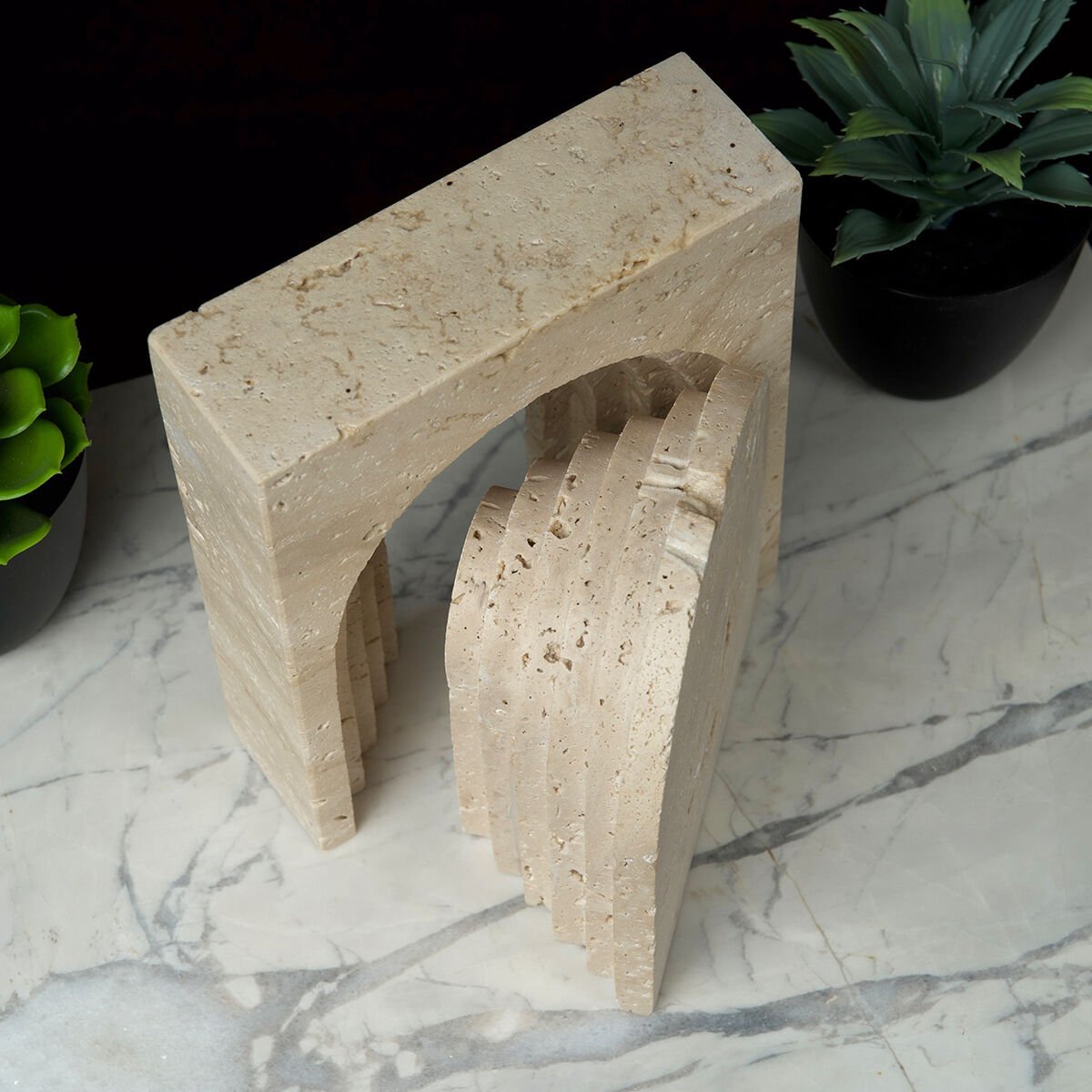 El işçiliğiyle şekillendirilen her Cascade Obje Set, traverten taşının doğallığı sayesinde tek ve eşsizdir. İster tek başına sergilensin ister bir set halinde kullanılsın, bulunduğu ortama sofistike bir atmosfer katar.