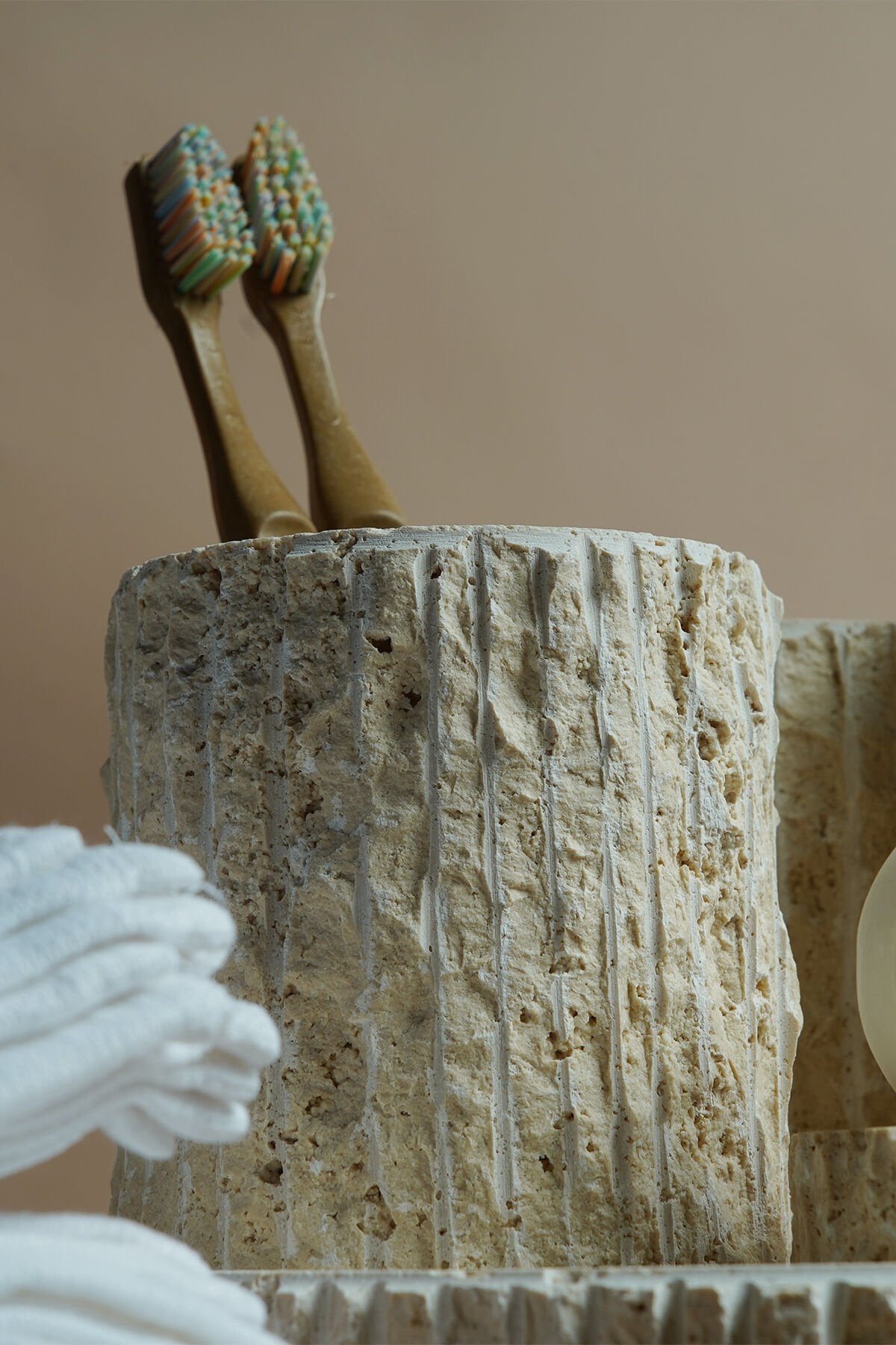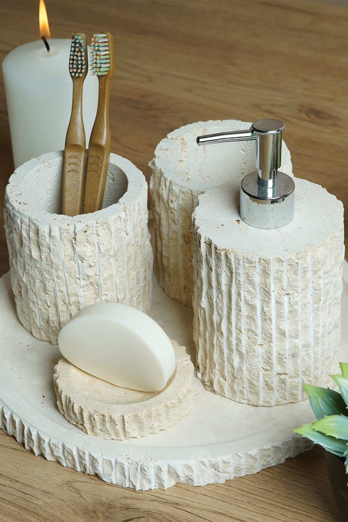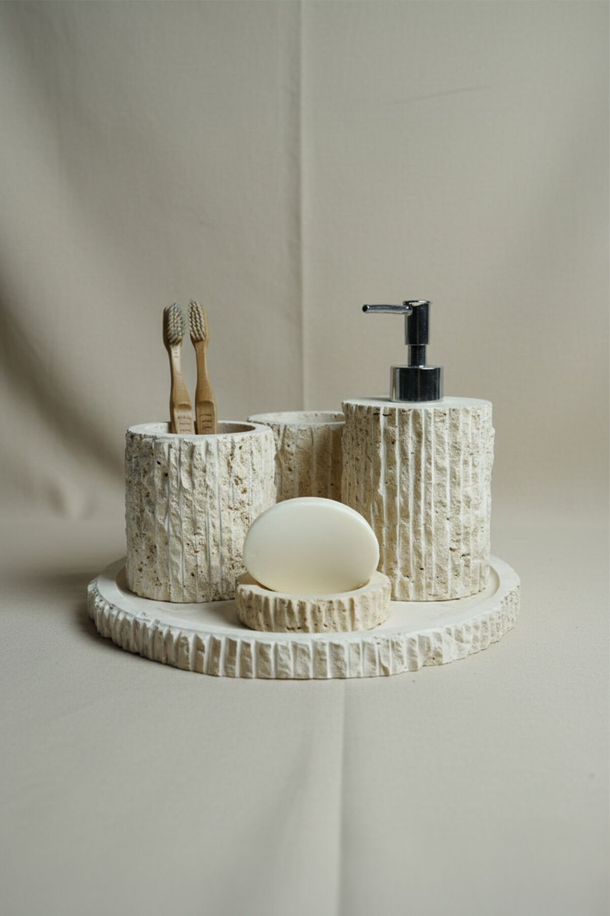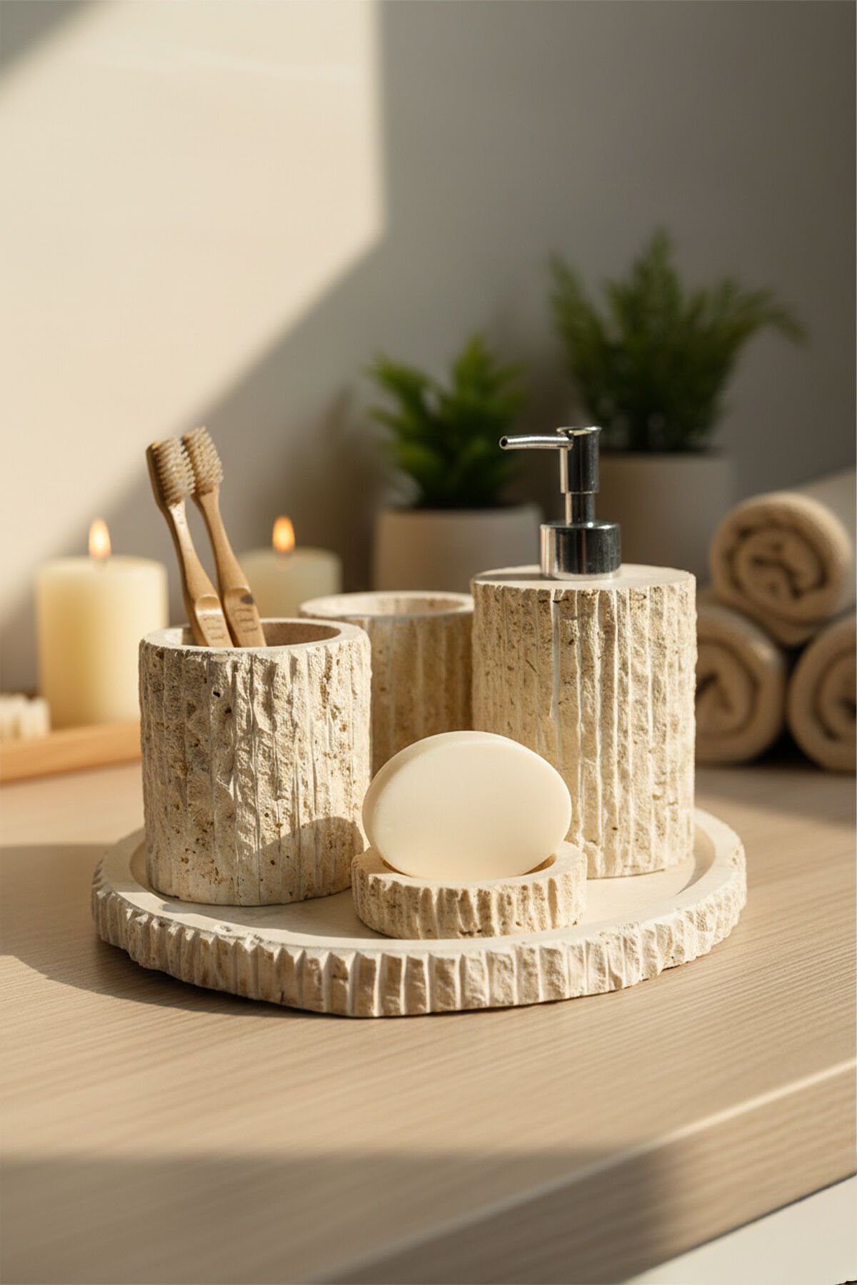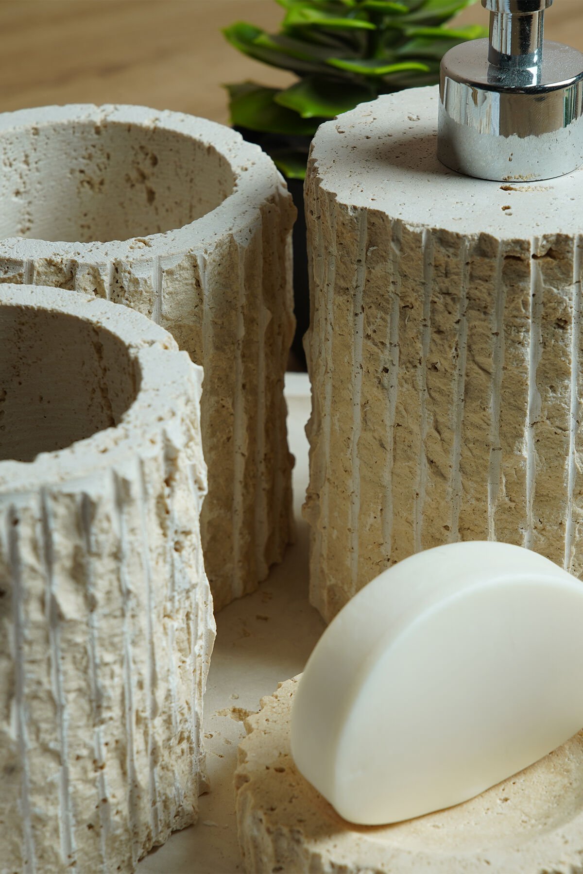 Doğal traverten taşının sıcak ve doğal dokusunu banyonuza taşıyan Traverten Mermer Banyo Seti, tamamen el işçiliği ile üretilmiş modern ve dekoratif bir banyo aksesuar takımıdır. Gözenekli traverten yüzeyi ve dikey oyma detayları sayesinde rustik, doğal ve şık bir görünüm sunar. Farklı renk ve doku varyantlarıyla her banyo dekorasyonuna uyum sağlar.